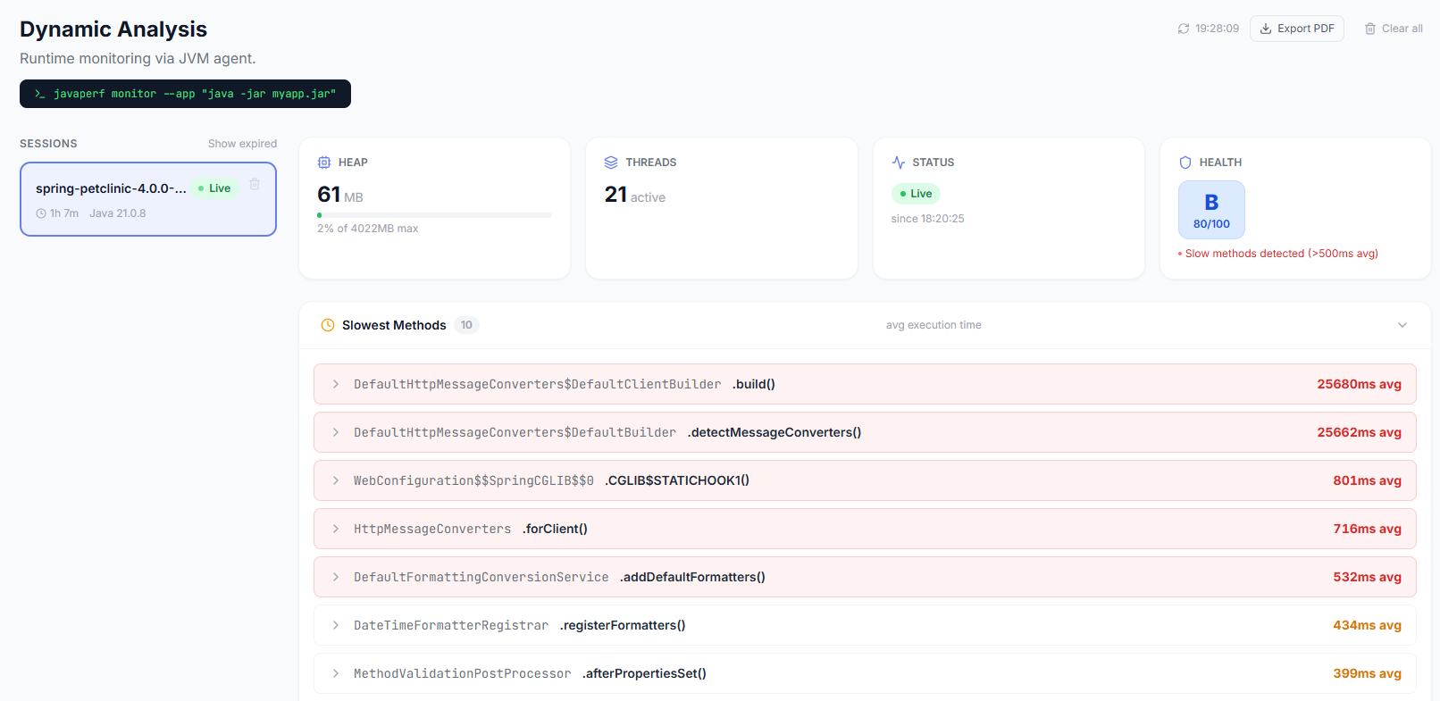 Static analysis tells you what could be slow. Dynamic monitoring tells you what is slow — with real invocation counts, real heap usage.